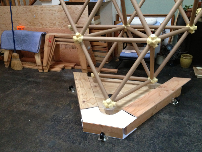 The vector is a typical 2” diameter kraft paper mailing tube. The node is a custom designed rigid polyurethane foam casting. Together the two become an all-space-filling, binary building system.