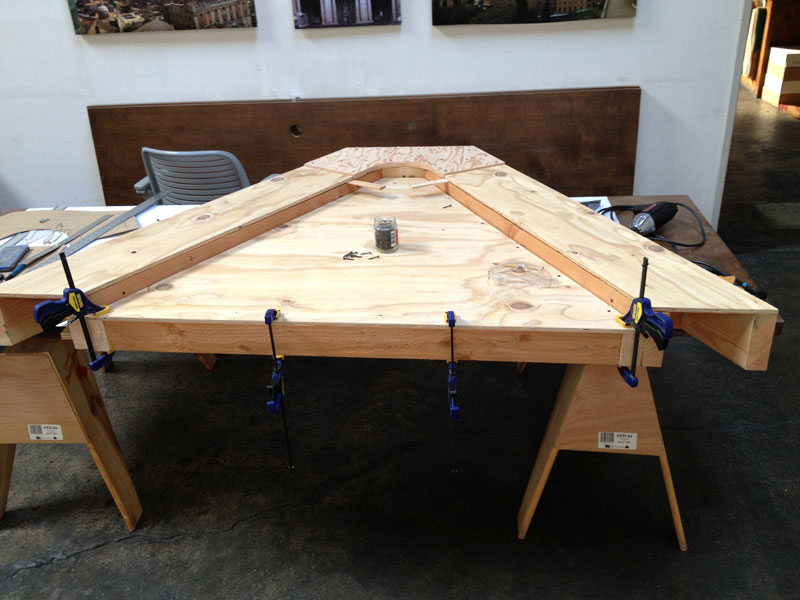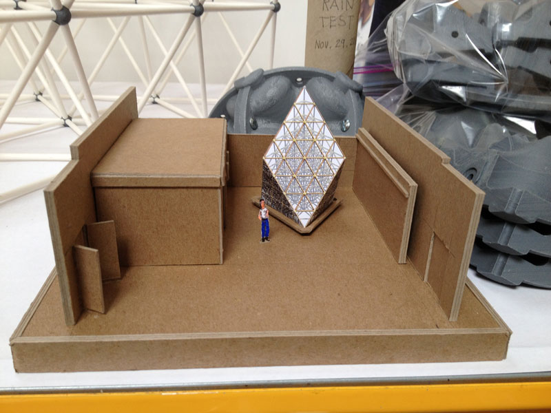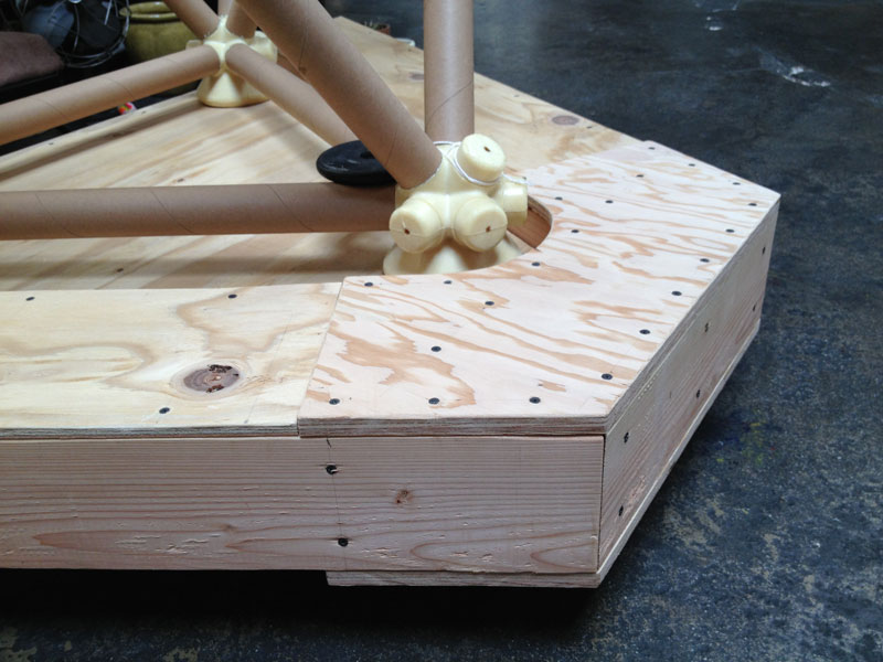 Building the full-scale mock-up gave me a good idea what the corner detail was going to look like and how the box beam edges get locked into them during assembly. To get a better feel for the behavior of the base structure as a whole I constructed the scale model. The scale of the base model coincides with the paper straw scale model of The ENERGY NODE Project.