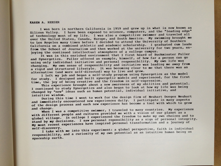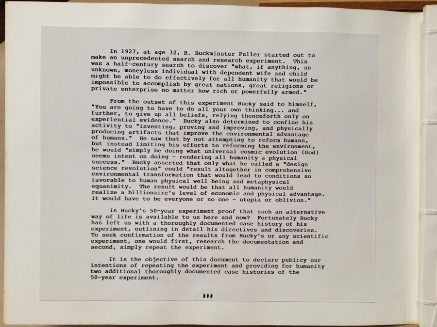 In 1984 I had the great privilege to spend eight weeks at the RBF Institute in Los Angeles working on the World Livingry Shelter Project. I was personally moved by Bucky's initiative and how much effort he devoted to documenting and preserving his 50 Year Experiment.