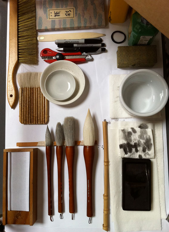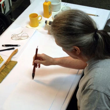 Position yourself squarely in front of the paper, plant your feet firmly on the floor, center your body and visualize the empty space in front of you. Visualize the “lead” polyhedron, hold the brush in an up right “center tip” position, focus on the tip of the brush hairs and let your creative expression emanate from the center of your body without confinement. Resist the impulse to amend or fix a stroke, you must rely on each subsequent stroke to create a balance and harmony on the page.