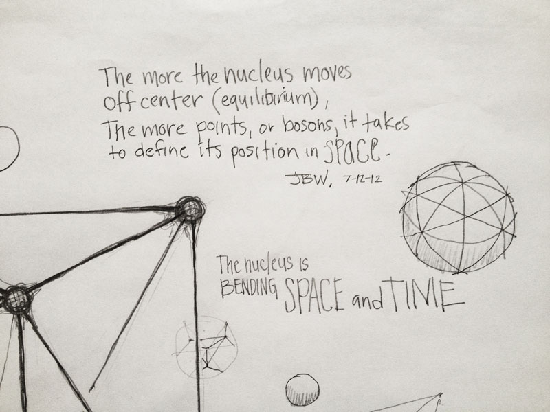 This is the concept: When the nucleus is in equilibrium it's defined by the 12 around 1 linear vectors... when the nucleus is activated, or energized, it moves off center... bending space/time. This requires Bezier type curves to define it's position in space... the more active it becomes the more control points (bosons) it takes to define the Bezier curves... (when you're "looking"!)