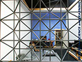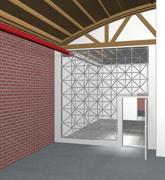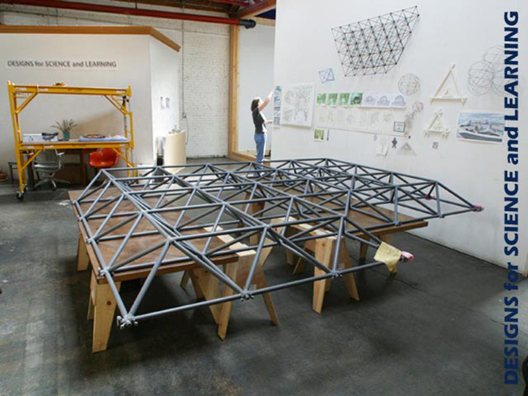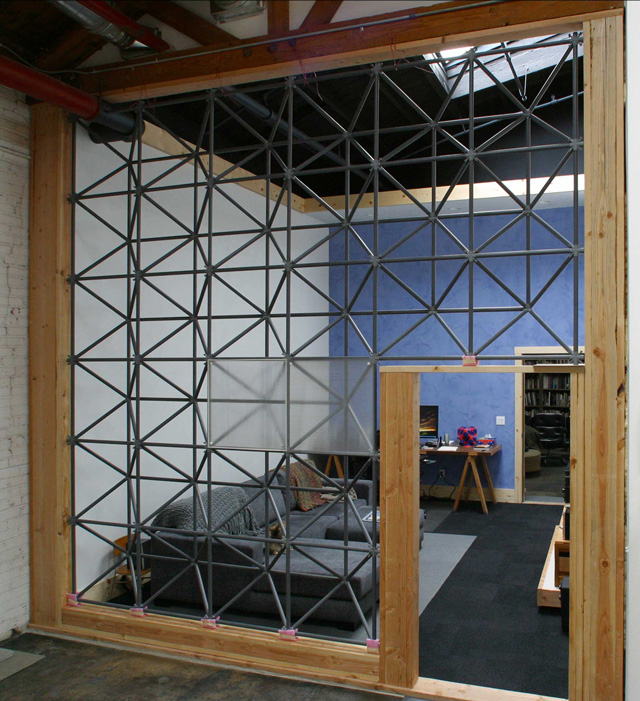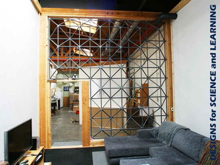 This is an interior spaceframe partition wall. It's made from typical ABS tubing and connected together with ABS plastic nodes. The nodes are all custom designed and made with the Dimension 3D Printer.