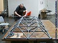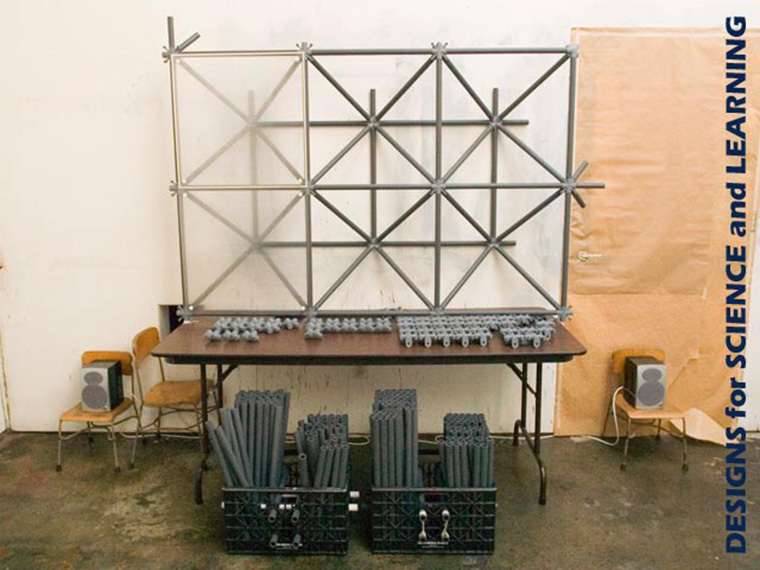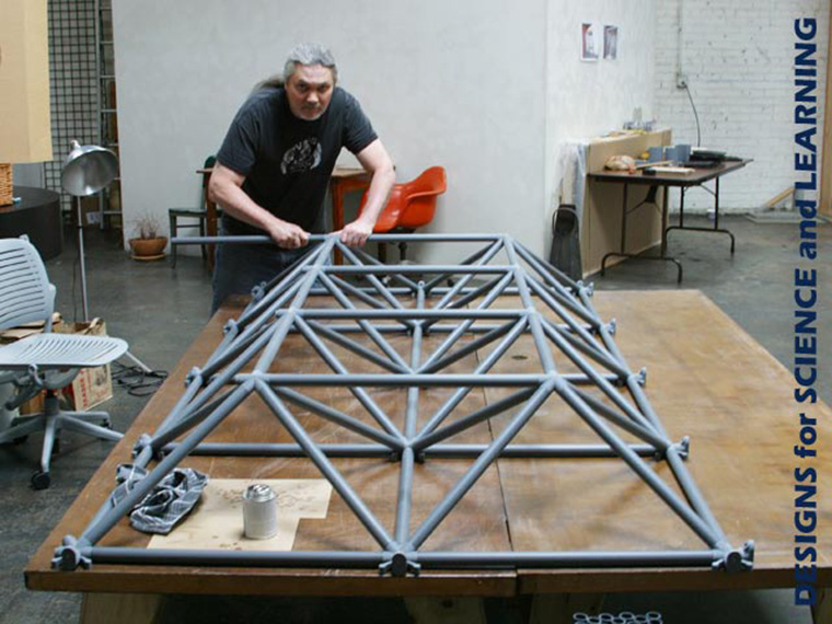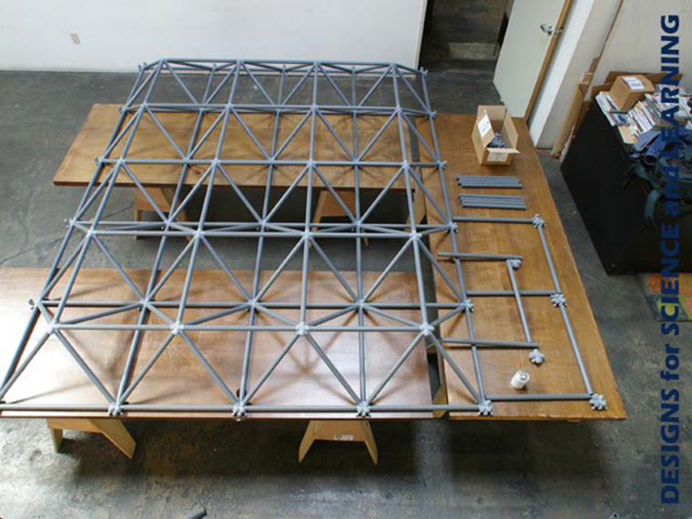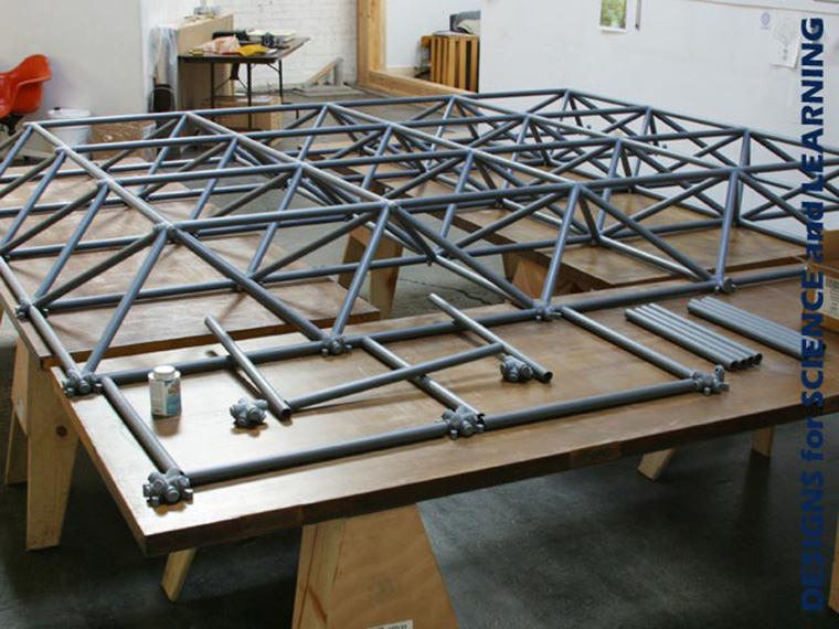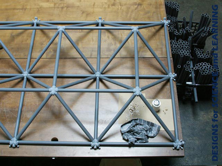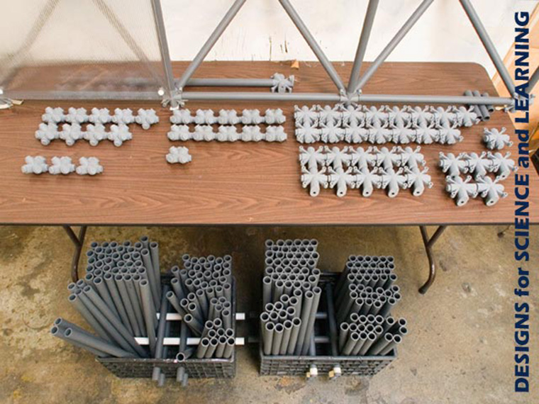 The connection nodes are made with the DIMENSION 3D Printer. The custom nodes are ABS plastic and all the pipes are ABS plastic, this made it easy to glue the structure together.