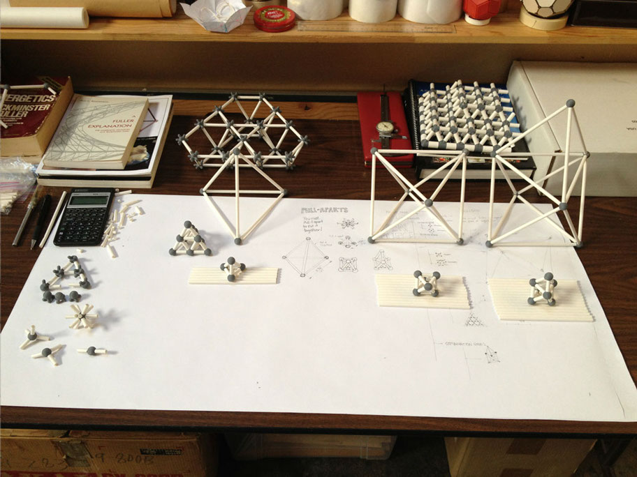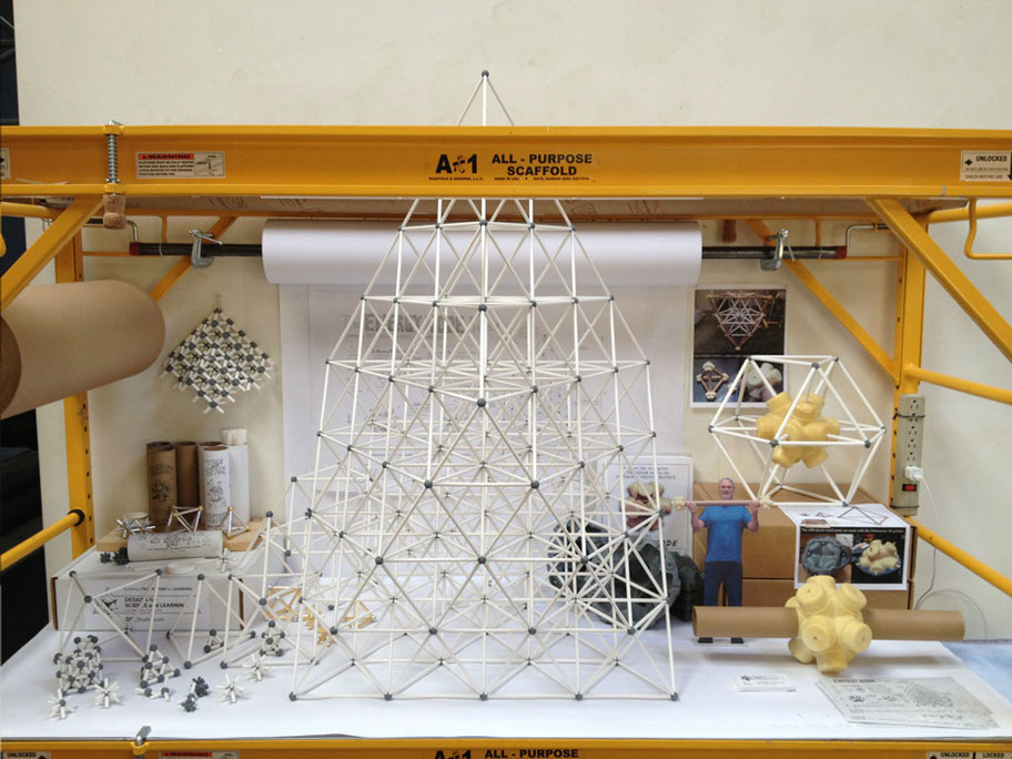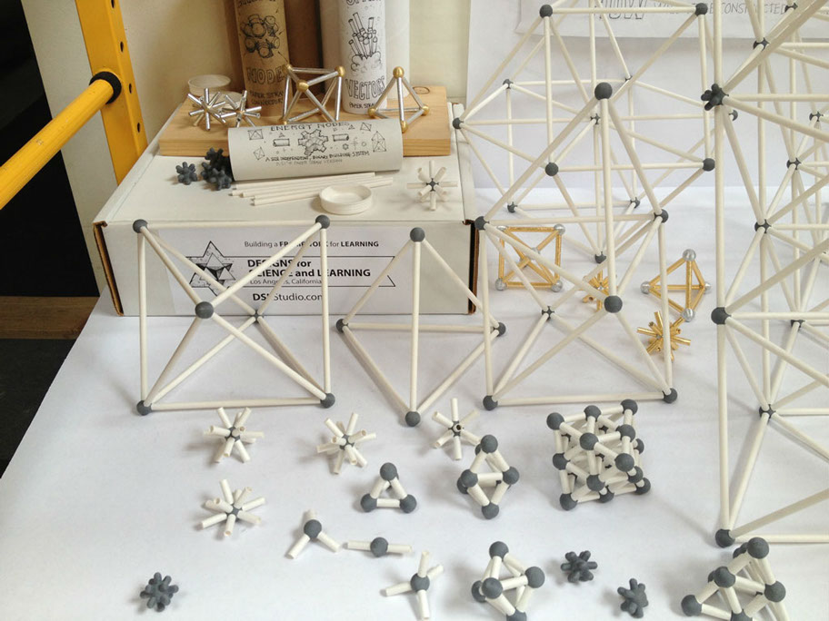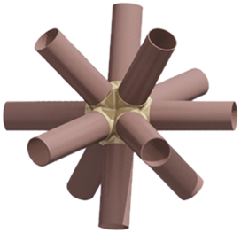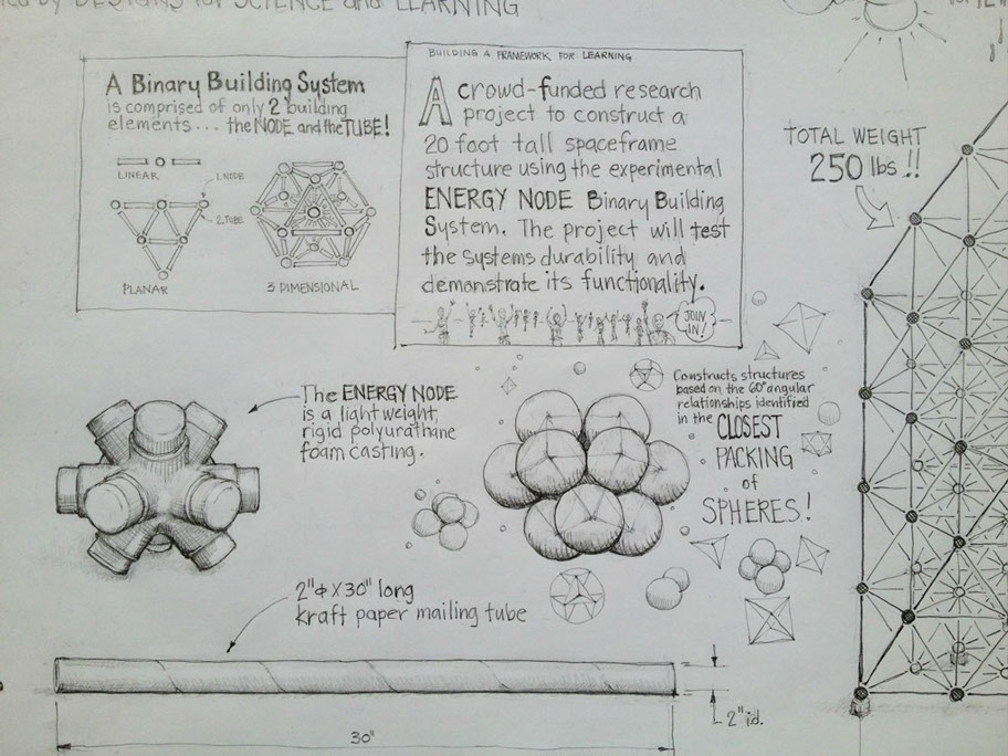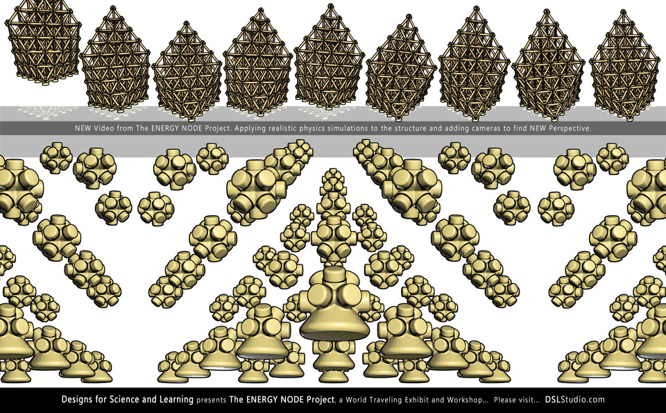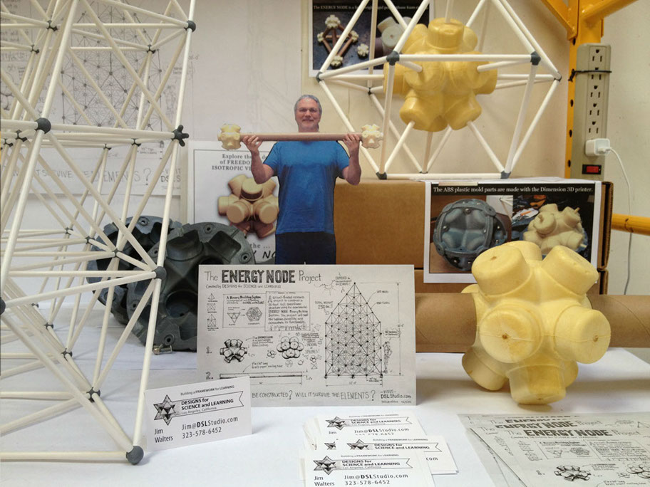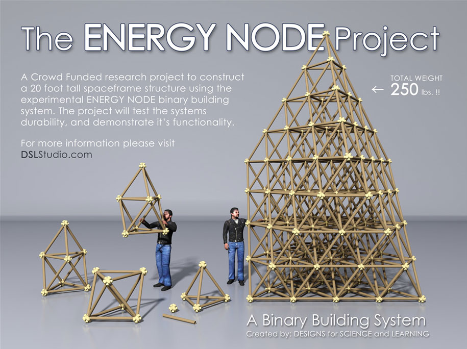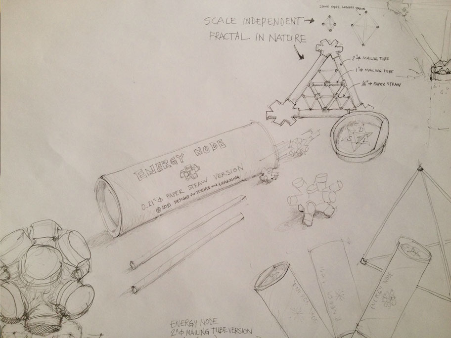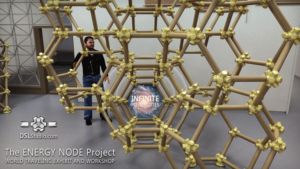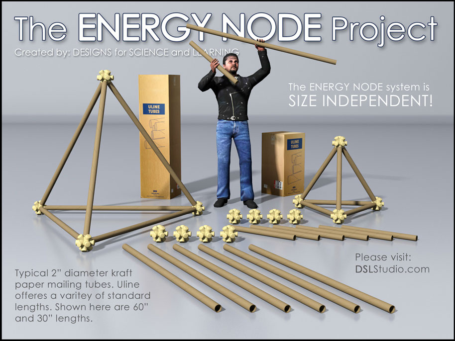 The ENERGY NODE, along with typical 2” diameter mailing tubes, becomes a SIZE INDEPENDENT building system. Explore the Isotropic Vector Matrix and create Octet Truss space frame structures.