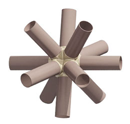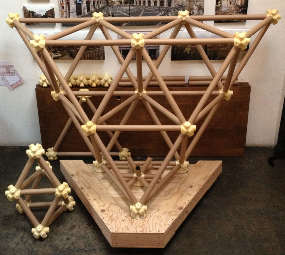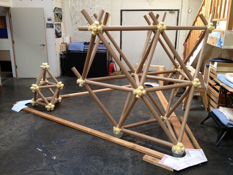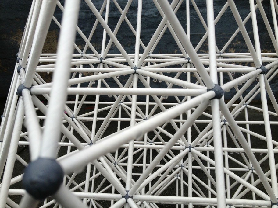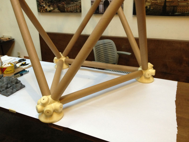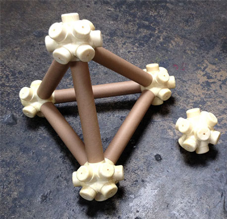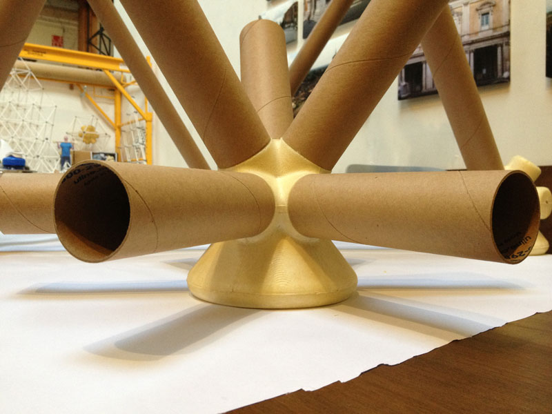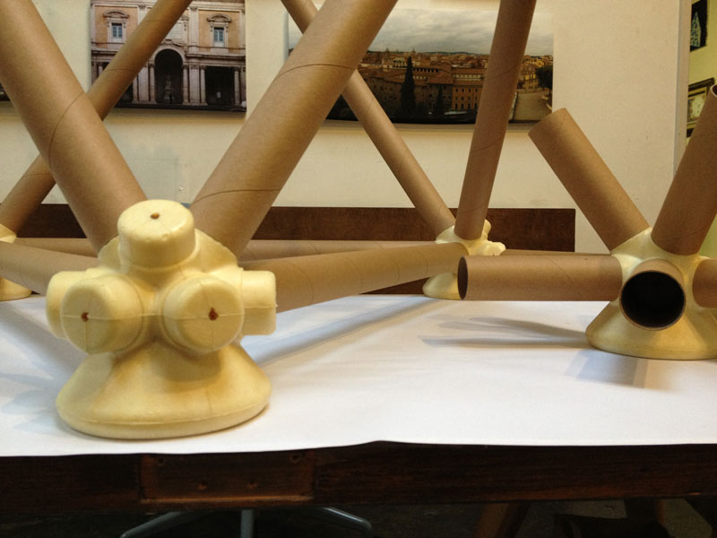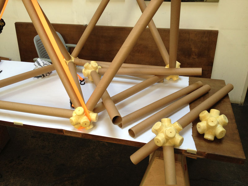 The vector is a typical 2” diameter kraft paper mailing tube. The node is a custom designed rigid polyurethane foam casting. Together the two become an all-space-filling, binary building system.