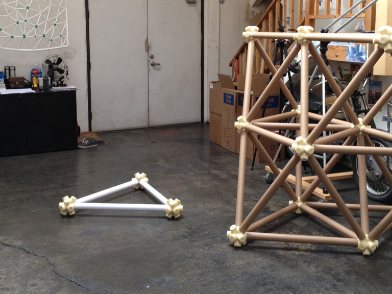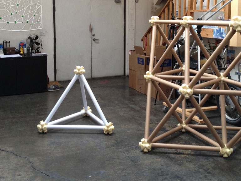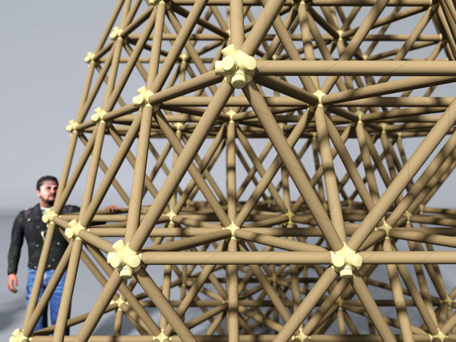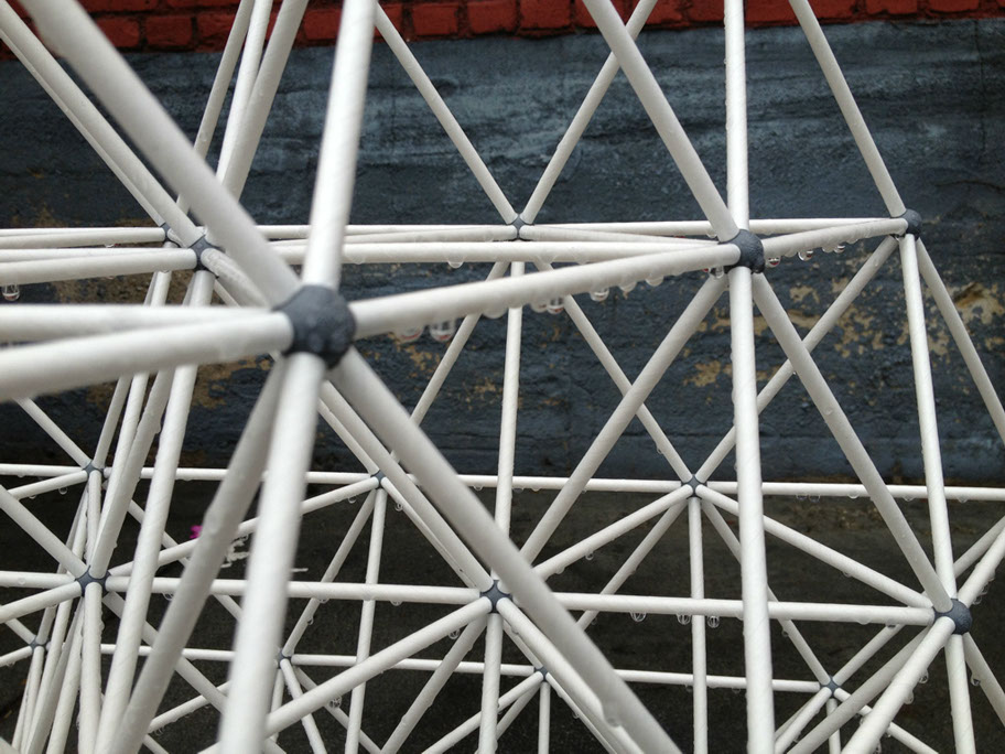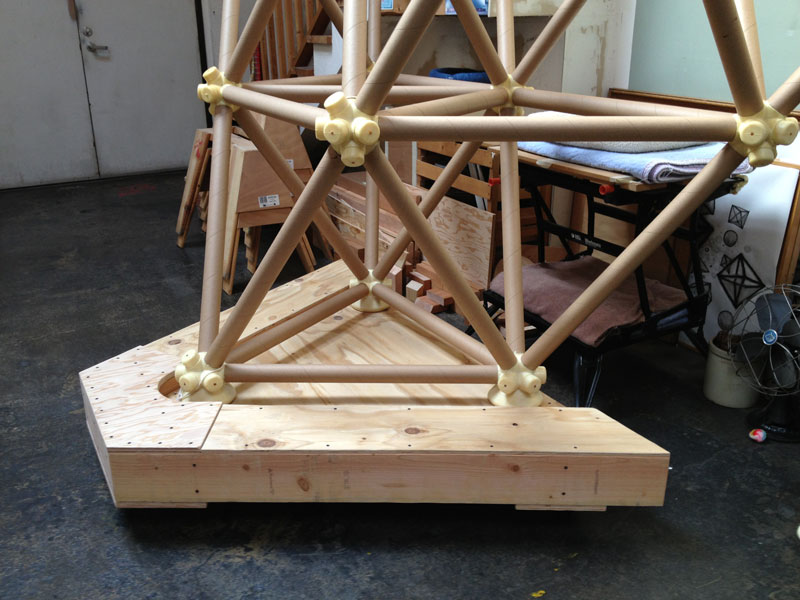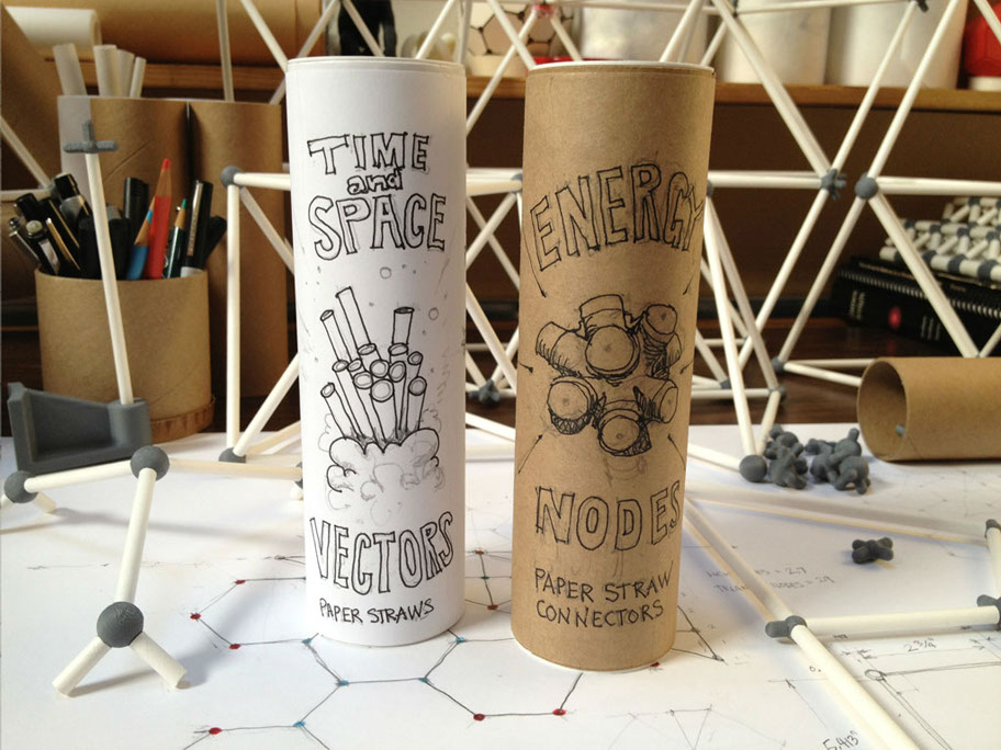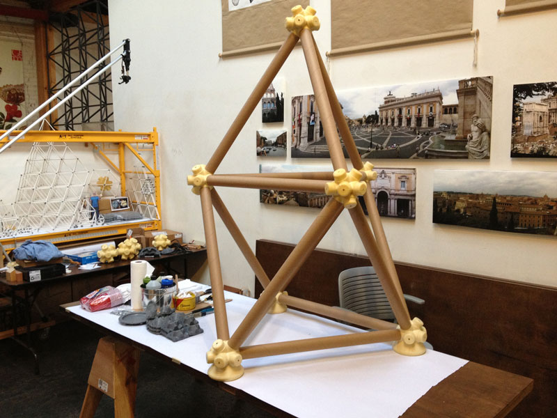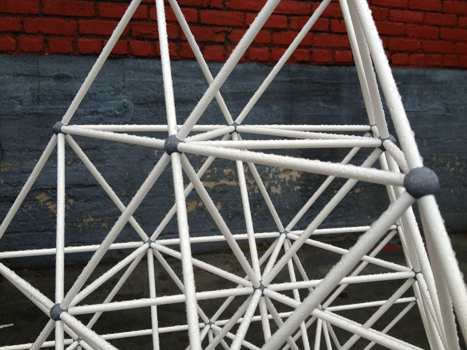The vector is a typical 2” diameter kraft paper mailing tube. The node is a custom designed rigid polyurethane foam casting. Together the two become an all-space-filling, binary building system.