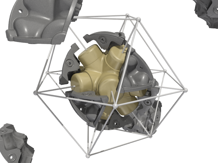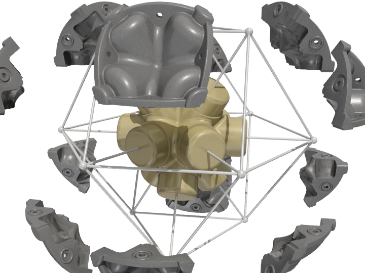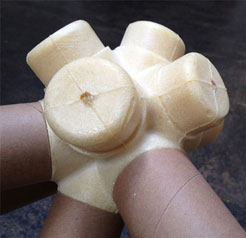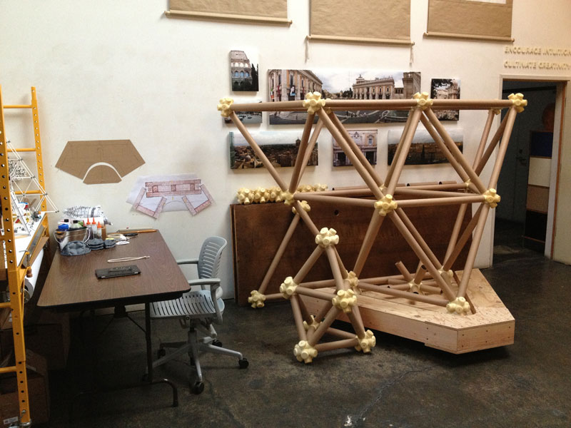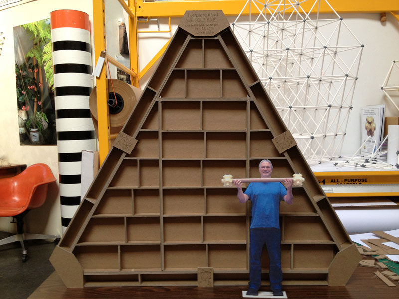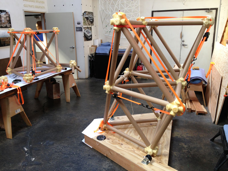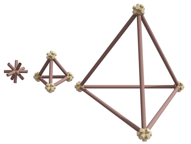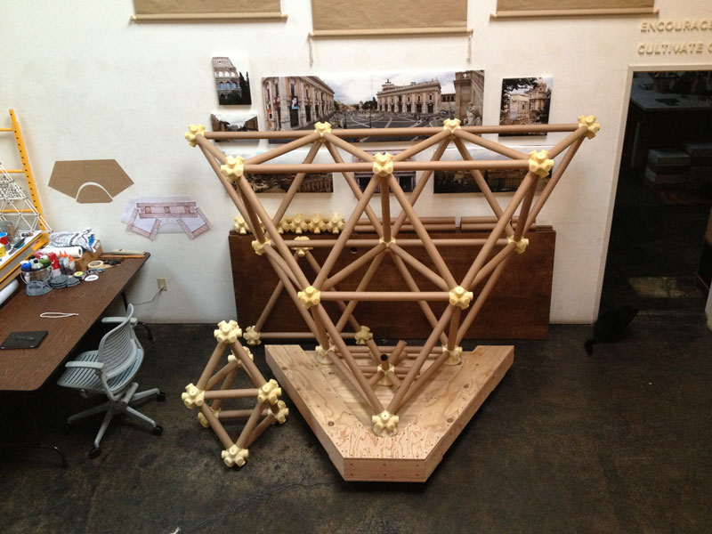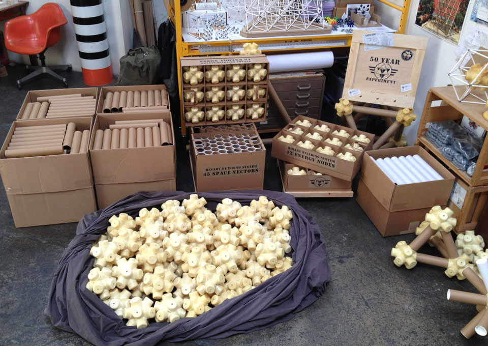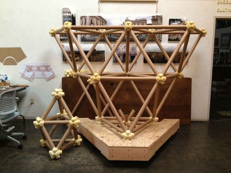 The vector is a typical 2” diameter kraft paper mailing tube. The node is a custom designed rigid polyurethane foam casting. Together the two become an all-space-filling, binary building system.