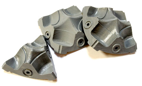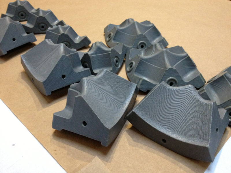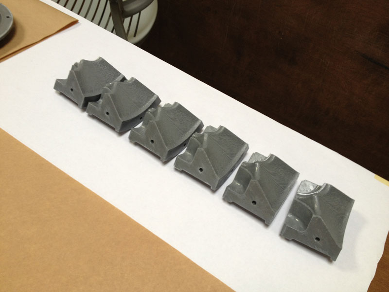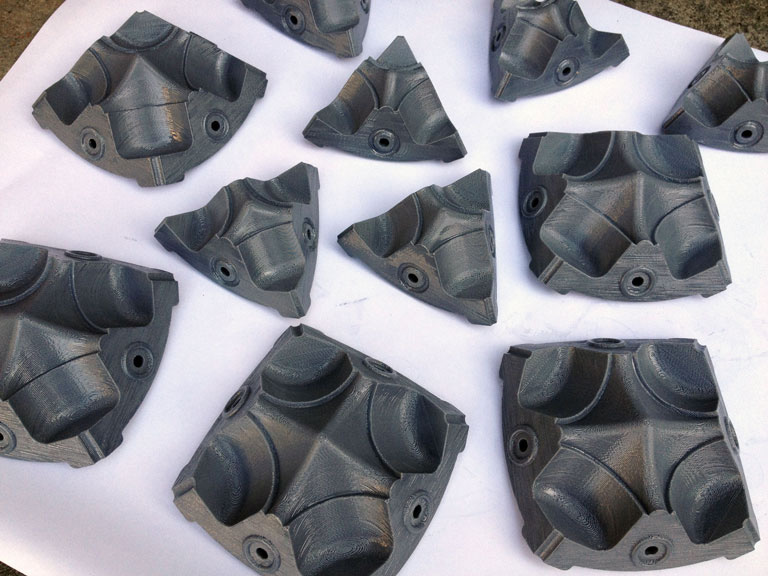 The mold parts were designed in SolidWorks, then fabricated using the Dimension 3D printer. The parts are ABS plastic and there are 6 square components and 8 triangular components.