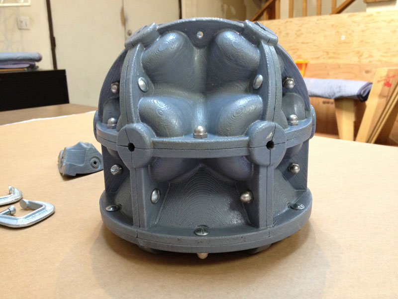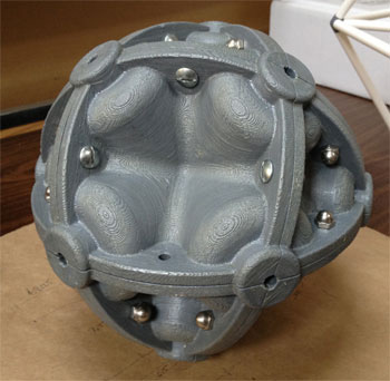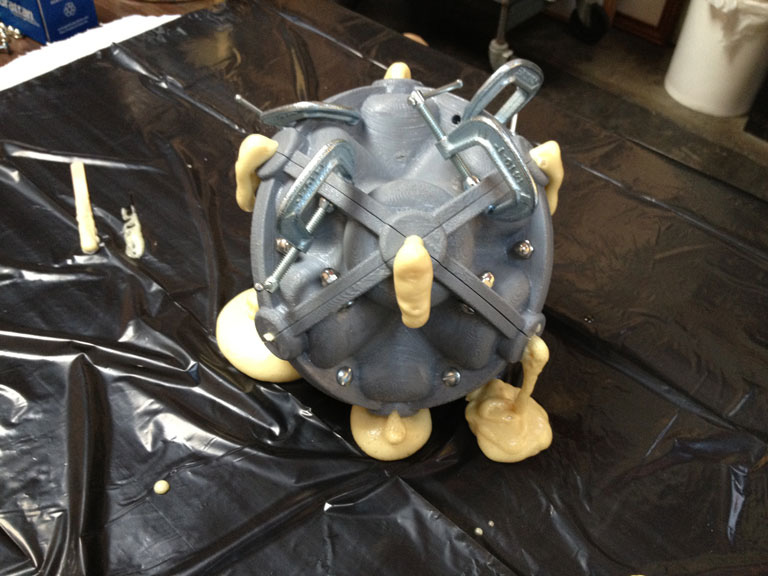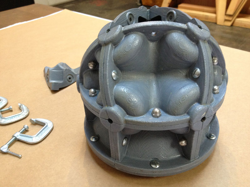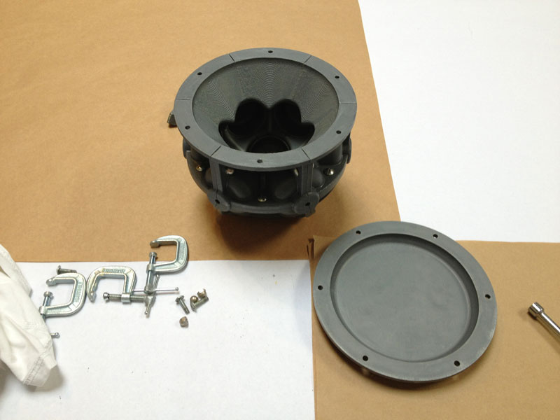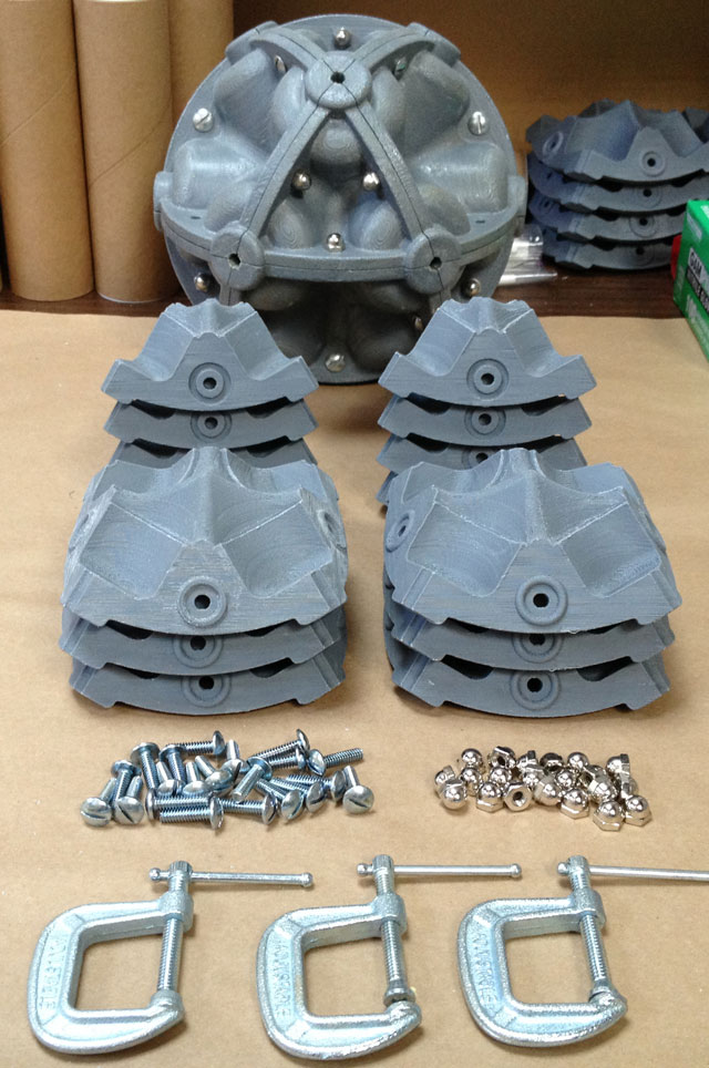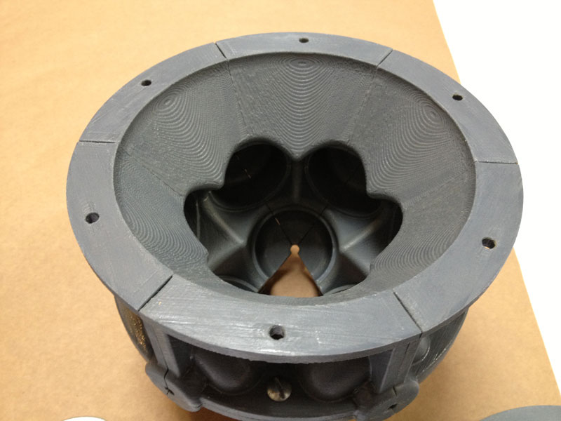 The modular nature of the casting molds made it easy to interchange components. The complete mold assembly still has the same number of parts... it just requires two new part types... the dished circular base and the 6 identical side parts... this assembles with a typical upper hemisphere.