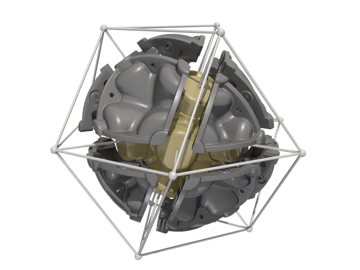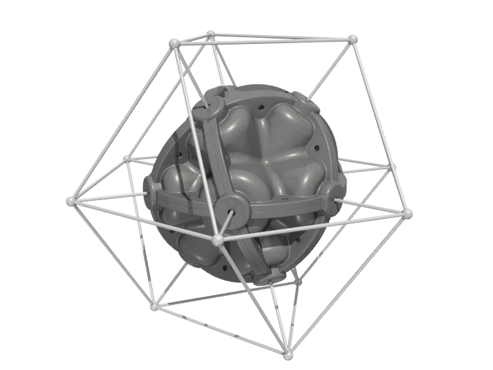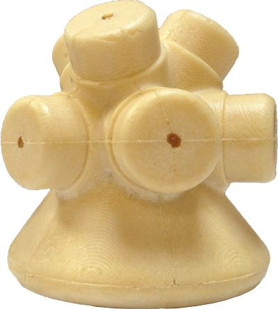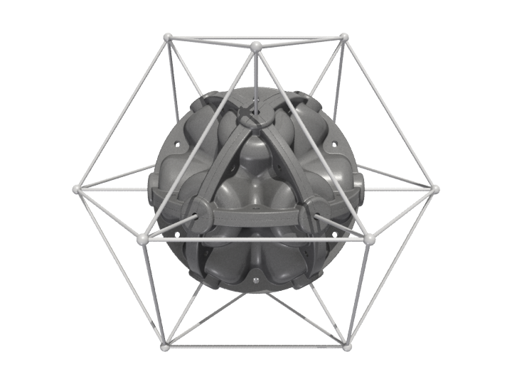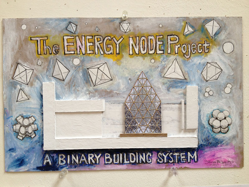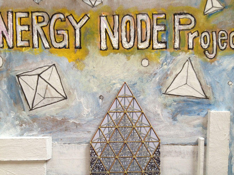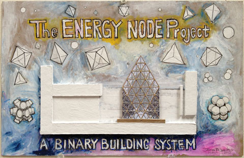 The result is the ENERGY NODE, a light weight, rigid polyurethane foam casting. The configuration of the node is based on the 60 degree angular relationships best described by Buckminster Fuller's Isotropic Vector Matrix.