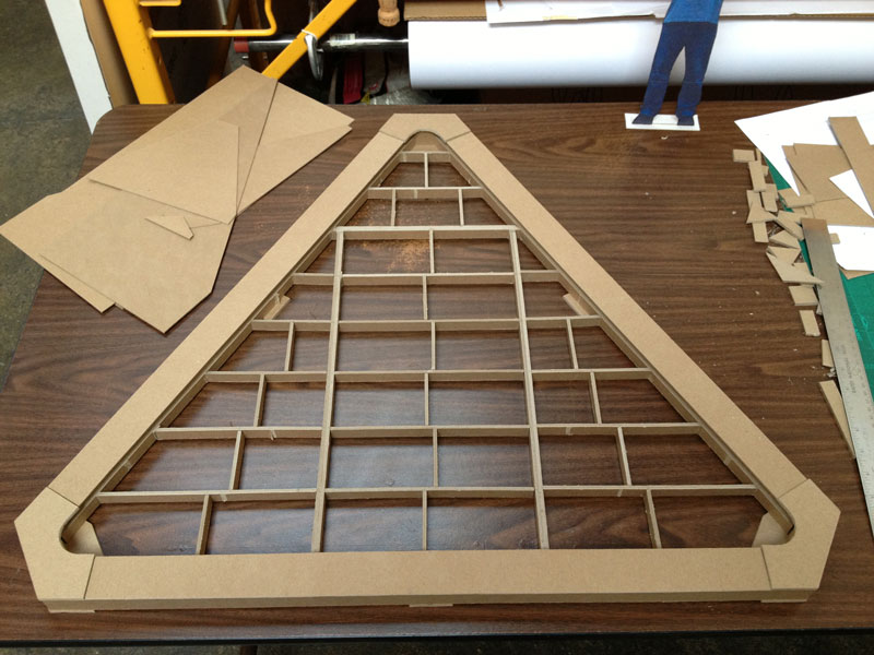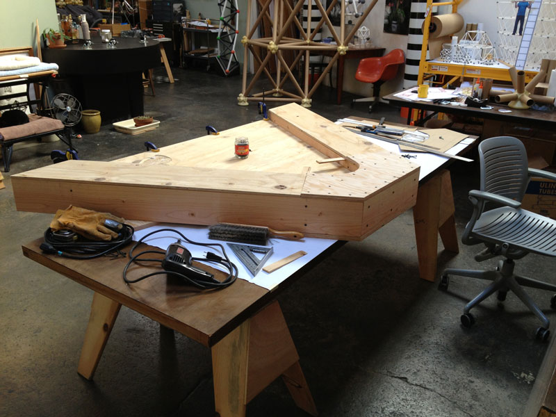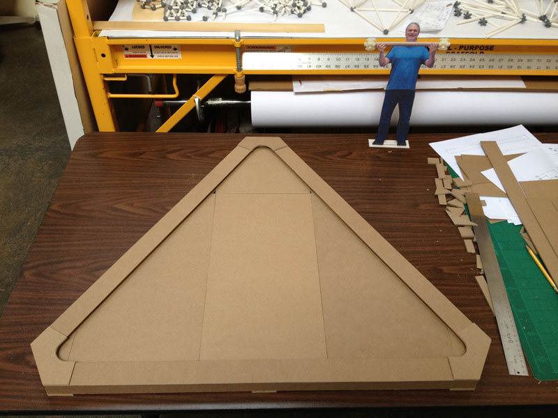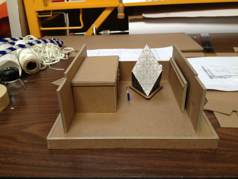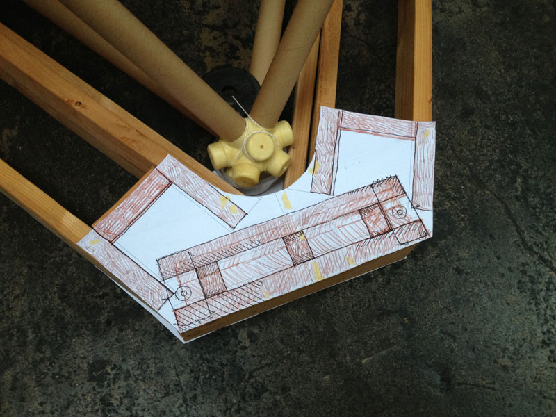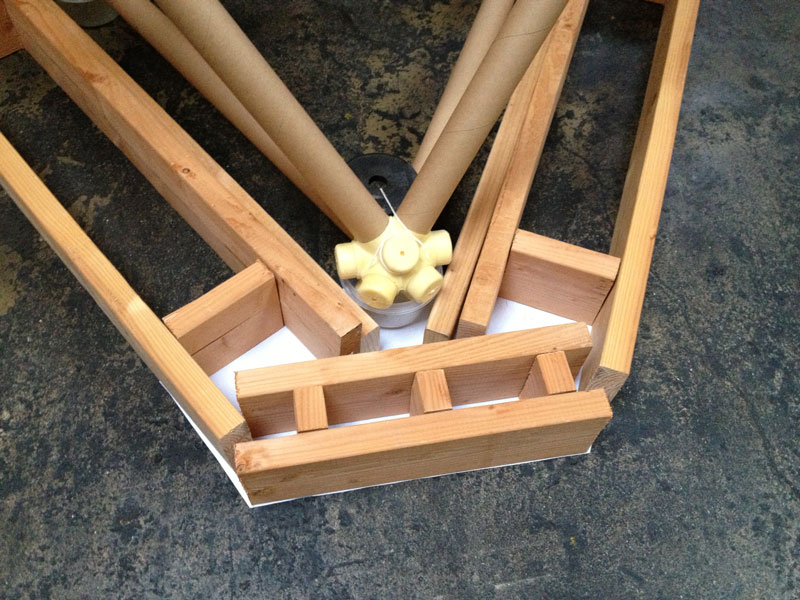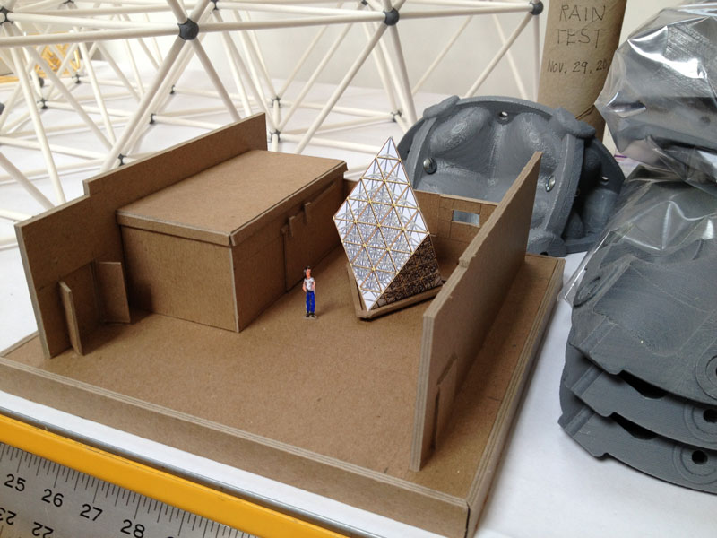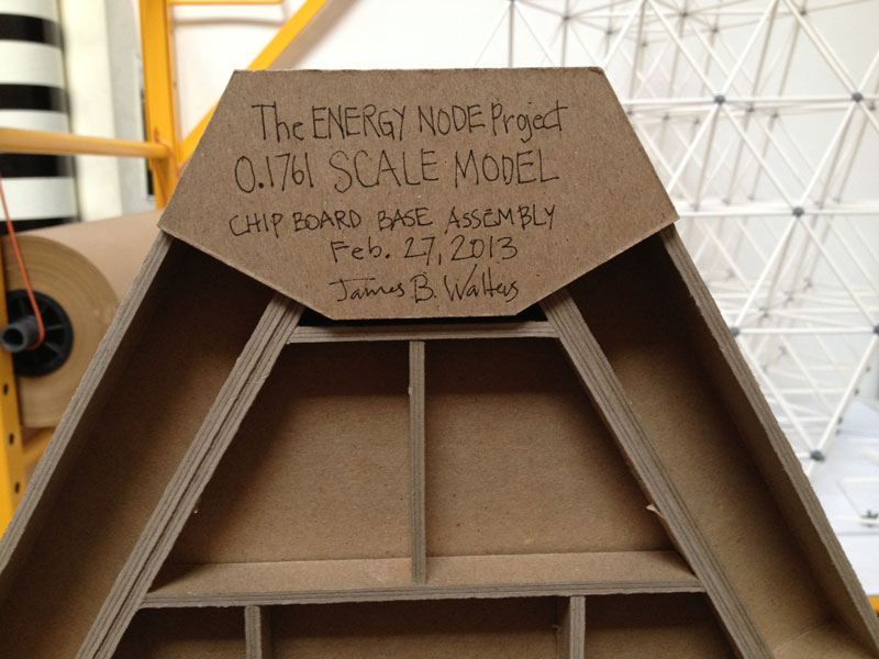 Building the full-scale mock-up gave me a good idea what the corner detail was going to look like and how the box beam edges get locked into them during assembly. To get a better feel for the behavior of the base structure as a whole I constructed the scale model. The scale of the base model coincides with the paper straw scale model of The ENERGY NODE Project.