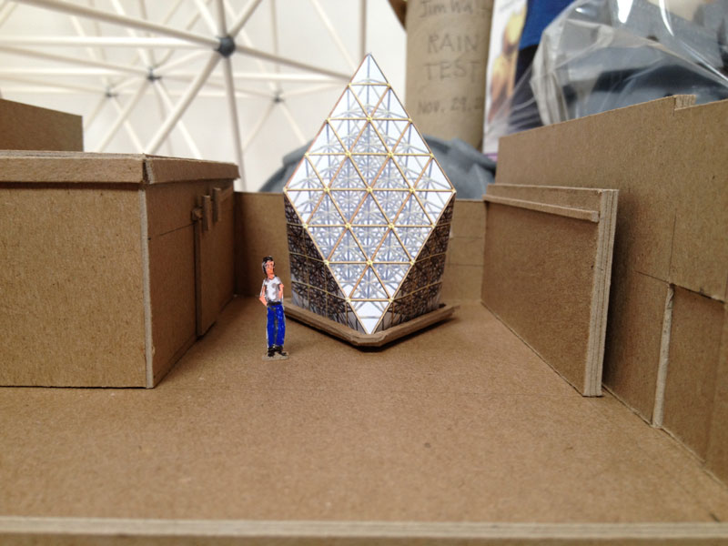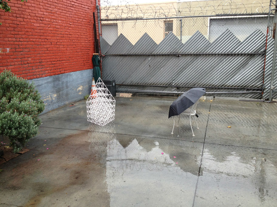 I had constructed a 1:10 scale model of the project made with 1/4” diameter paper drinking straws to determine the most efficient construction sequence for the 20’ tall structure made with 2” diameter kraft paper mailing tubes. So I brought the scale model out and sat it in the rain for five hours! Because the drinking straw and the mailing tubes are both paper products and are made with a similar spiral laminated construction I wanted to experience first hand how this structure would preform in the rain.