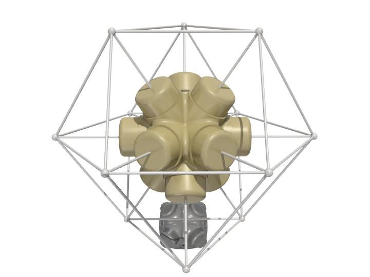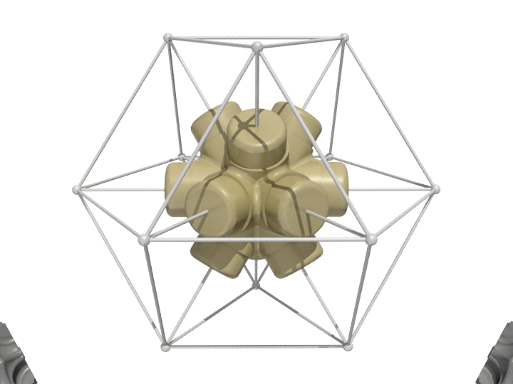 The configuration of the node is based on the 60 degree angular relationships best described by Buckminster Fuller's Isotropic Vector Matrix.